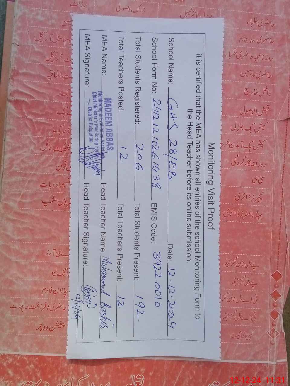 | Attendance Register | Head Teacher | MEA with School | Visit Proof |