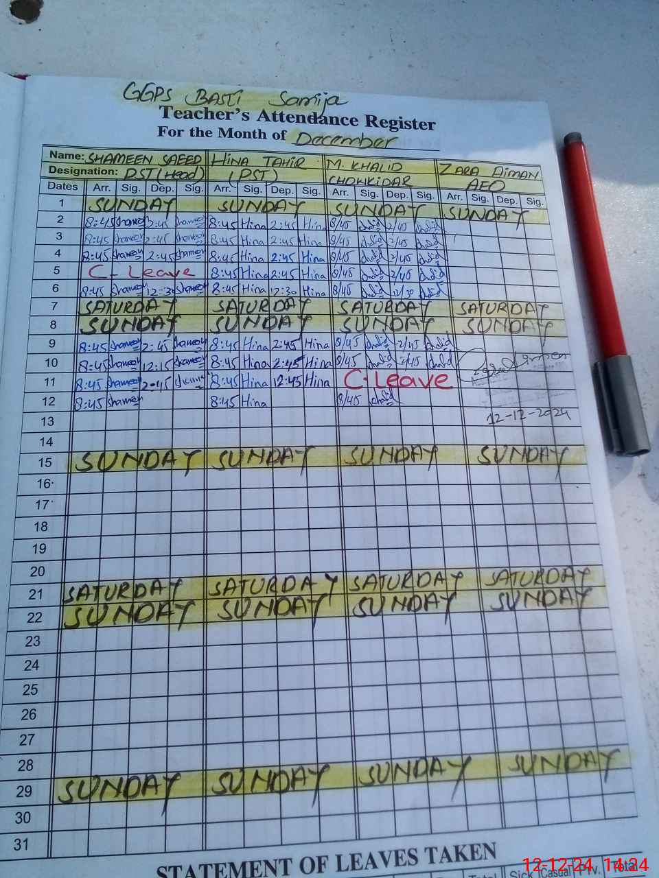 | CNIC | Full Name | Designation | R/C | Absence During Last Calender Month |