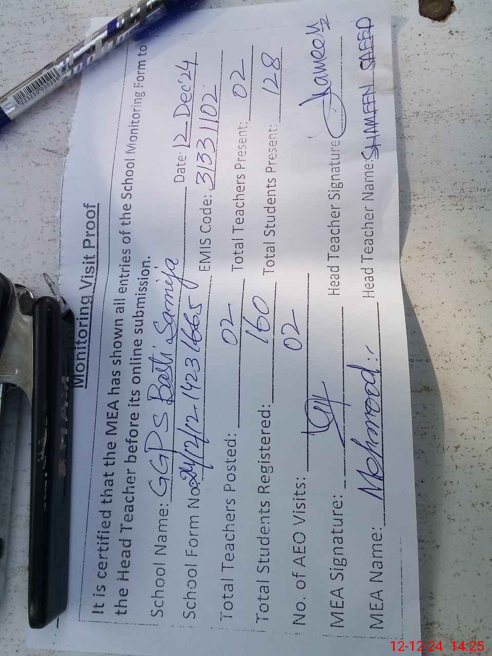 | Attendance Register | Head Teacher | MEA with School | Visit Proof |