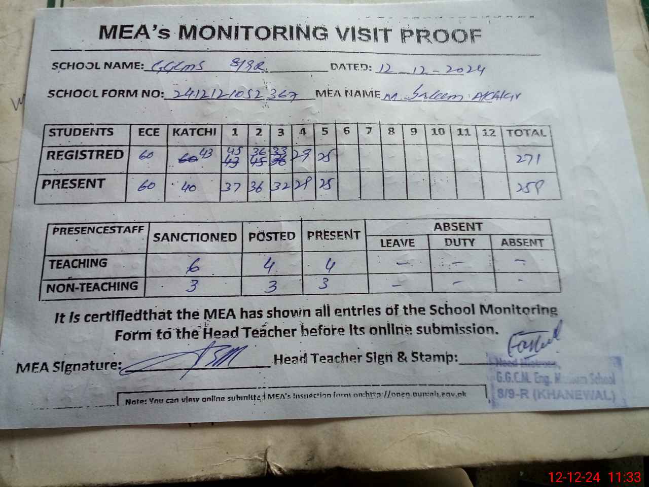 | Attendance Register | Head Teacher | MEA with School | Visit Proof |