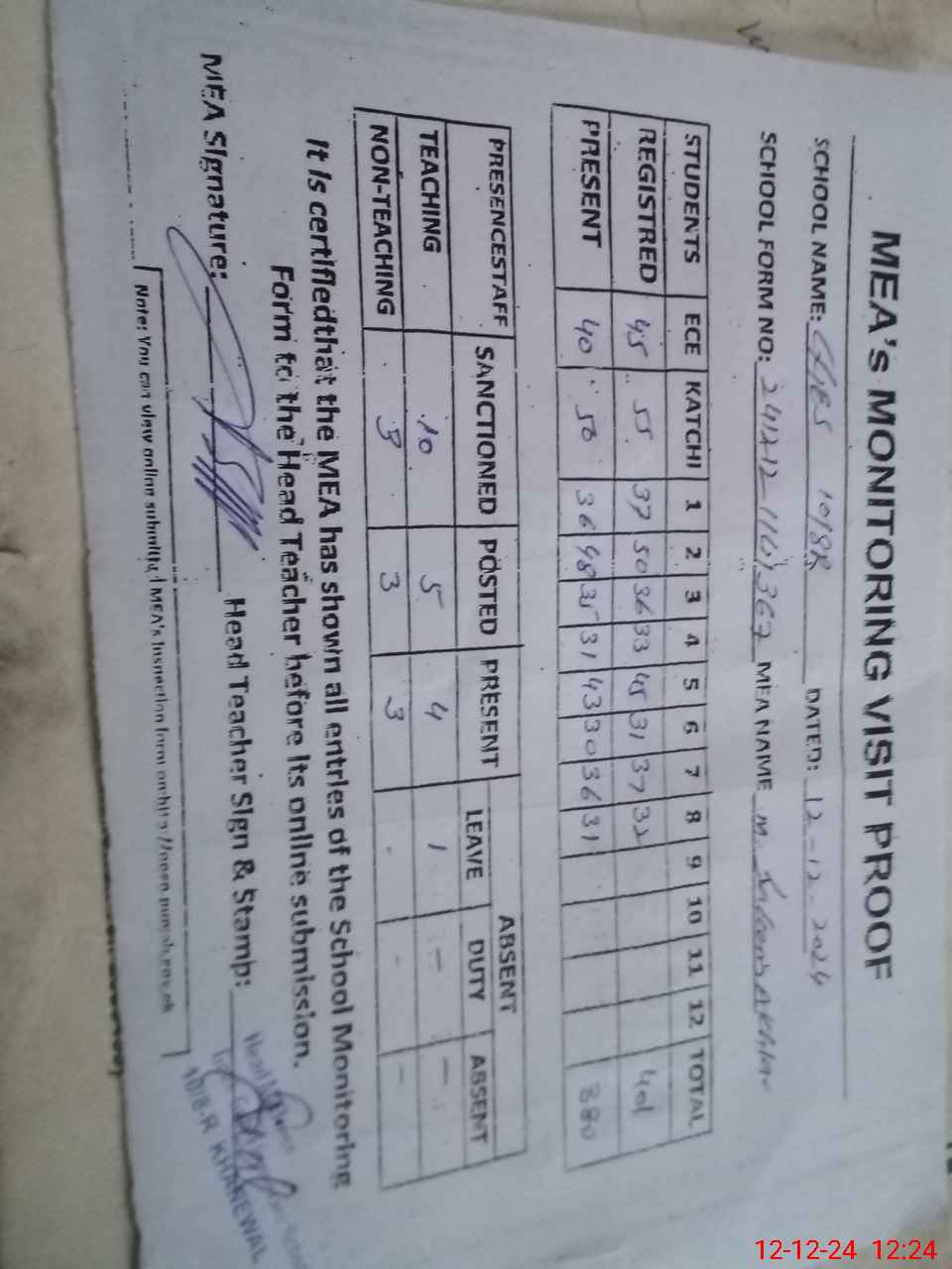 | Attendance Register | Head Teacher | MEA with School | Visit Proof |