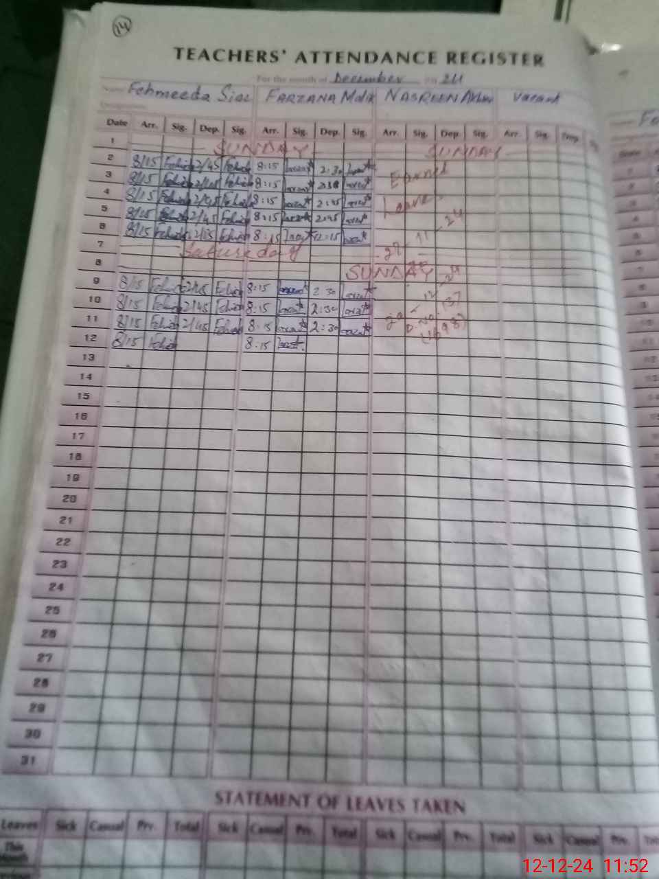 | CNIC | Full Name | Designation | R/C | Absence During Last Calender Month |