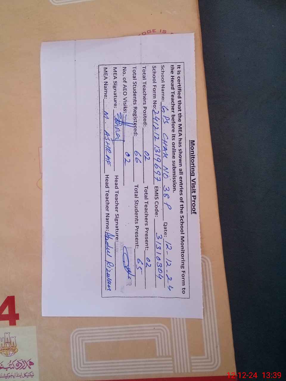 | Attendance Register | Head Teacher | MEA with School | Visit Proof |