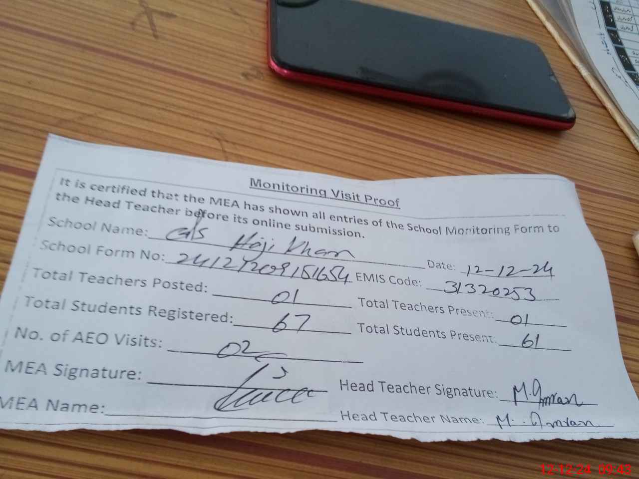 | Attendance Register | Head Teacher | MEA with School | Visit Proof |