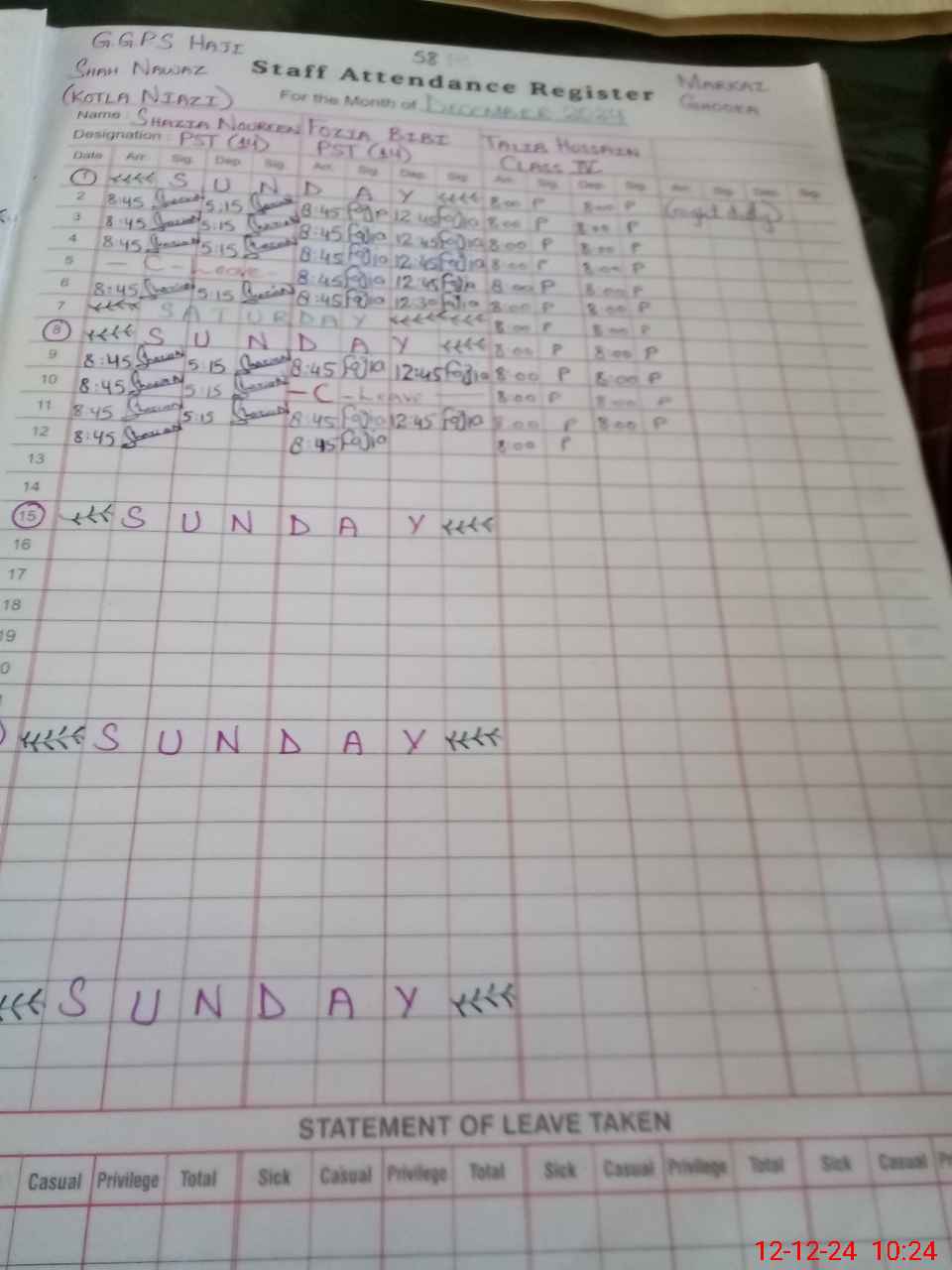| CNIC | Full Name | Designation | R/C | Absence During Last Calender Month |