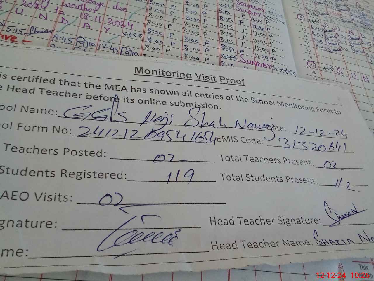 | Attendance Register | Head Teacher | MEA with School | Visit Proof |