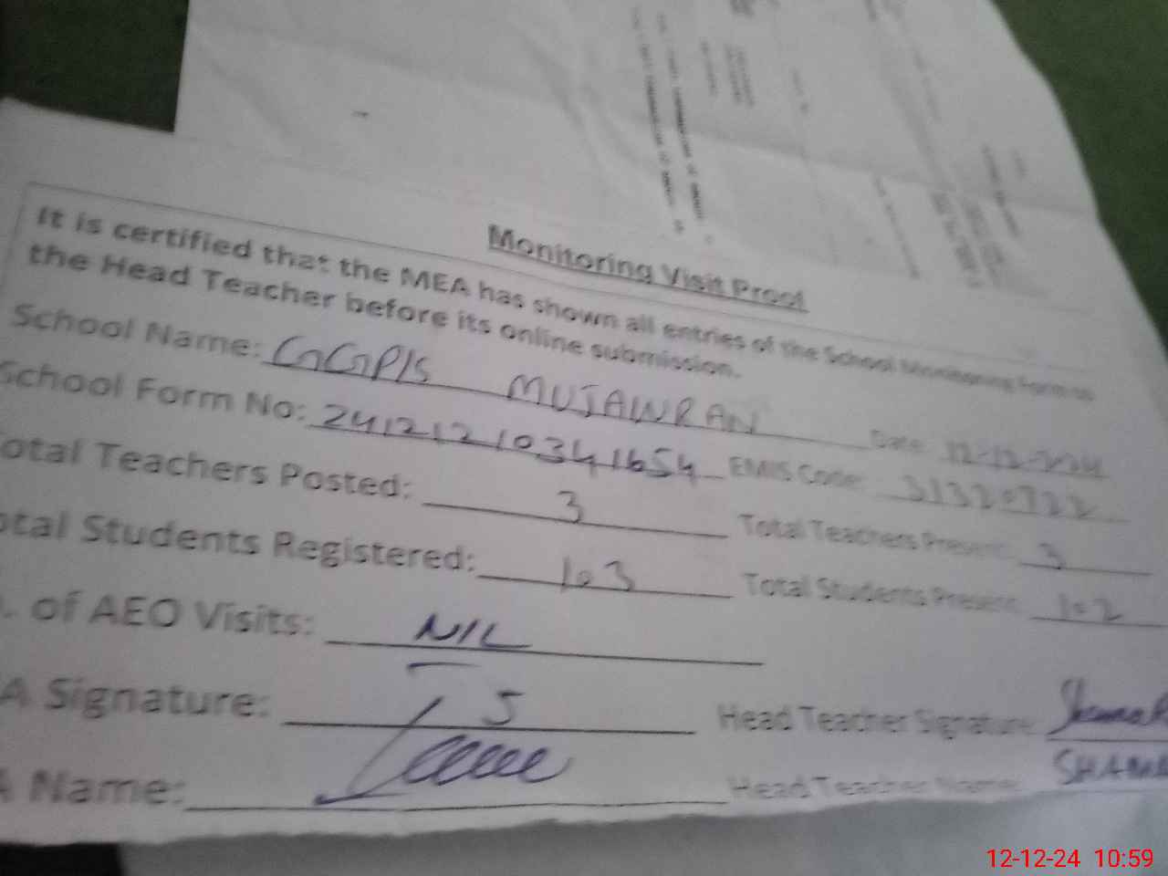 | Attendance Register | Head Teacher | MEA with School | Visit Proof |