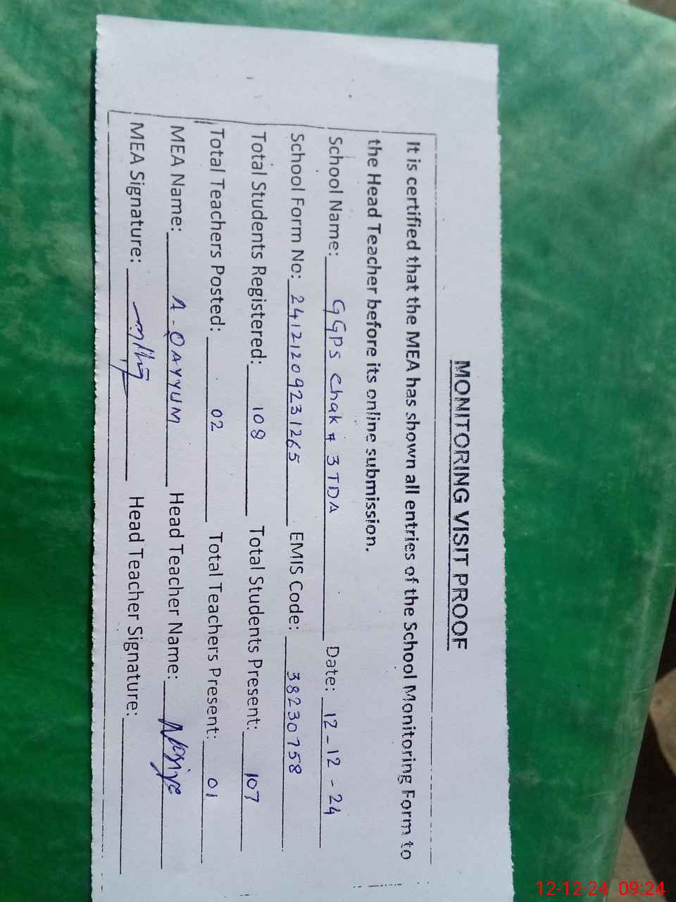| Attendance Register | Head Teacher | MEA with School | Visit Proof |