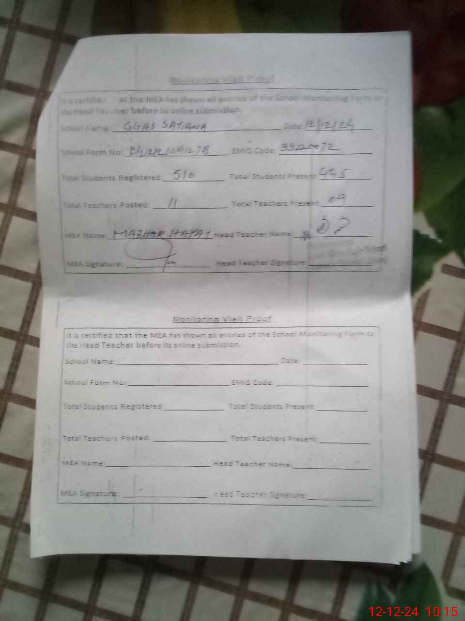 | Certified that this School was Inspected by the Undersigned MEA/DMO Today and the Information Stated Above is as Per Record. | |||||