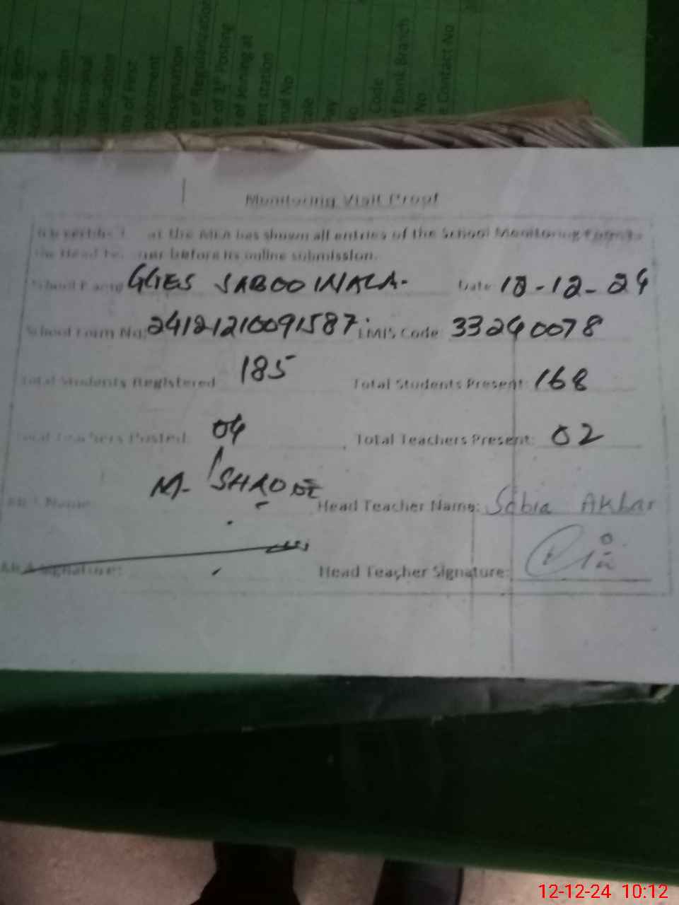 | Attendance Register | Head Teacher | MEA with School | Visit Proof |