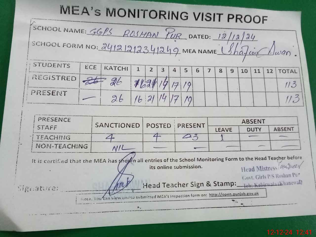 | EMIS Code: 36410462 | Name of School: GGPS ROSHAN PUR, ABDUL HAKIM | |||