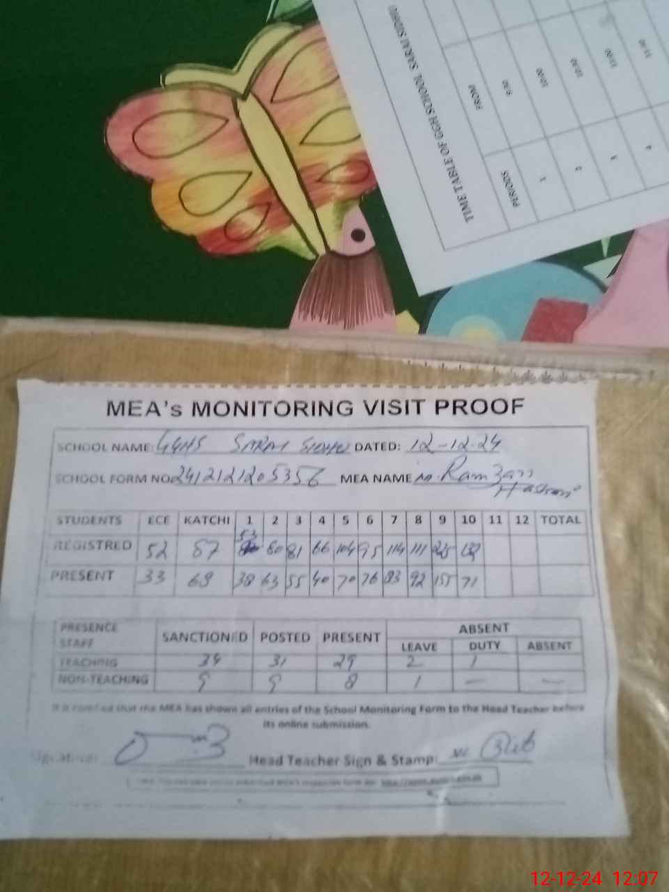 | Attendance Register | Head Teacher | MEA with School | Visit Proof |