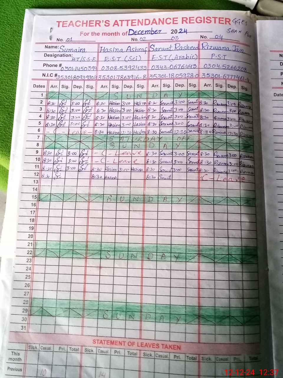 | CNIC | Full Name | Designation | R/C | Absence During Last Calender Month |