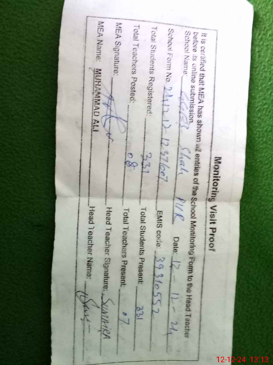 | Attendance Register | Head Teacher | MEA with School | Visit Proof |