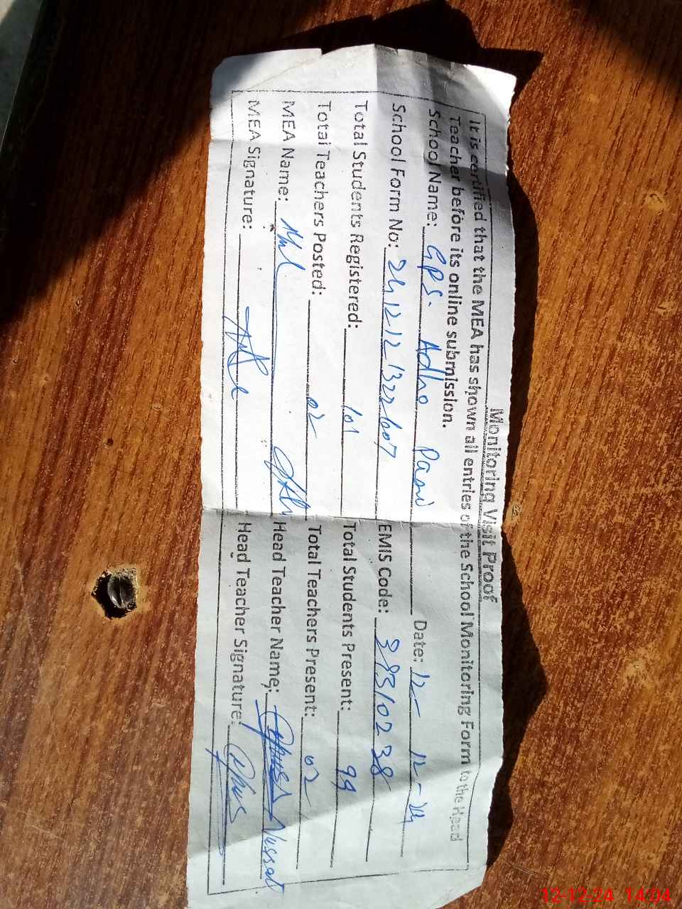 | Attendance Register | Head Teacher | MEA with School | Visit Proof |