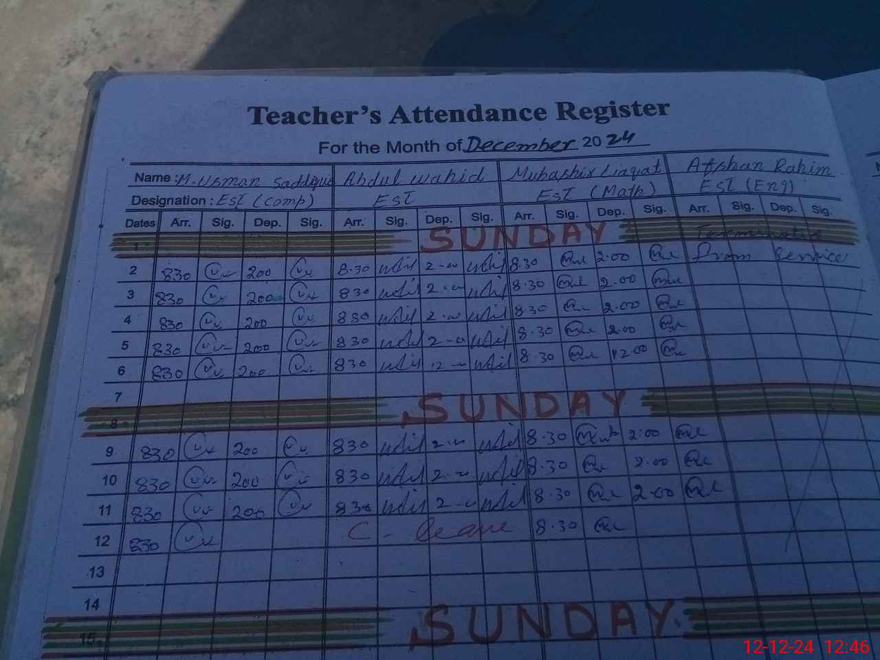 | CNIC | Full Name | Designation | R/C | Absence During Last Calender Month |