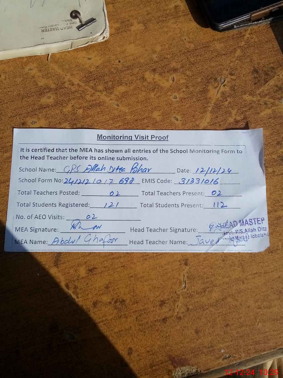 | Attendance Register | Head Teacher | MEA with School | Visit Proof |