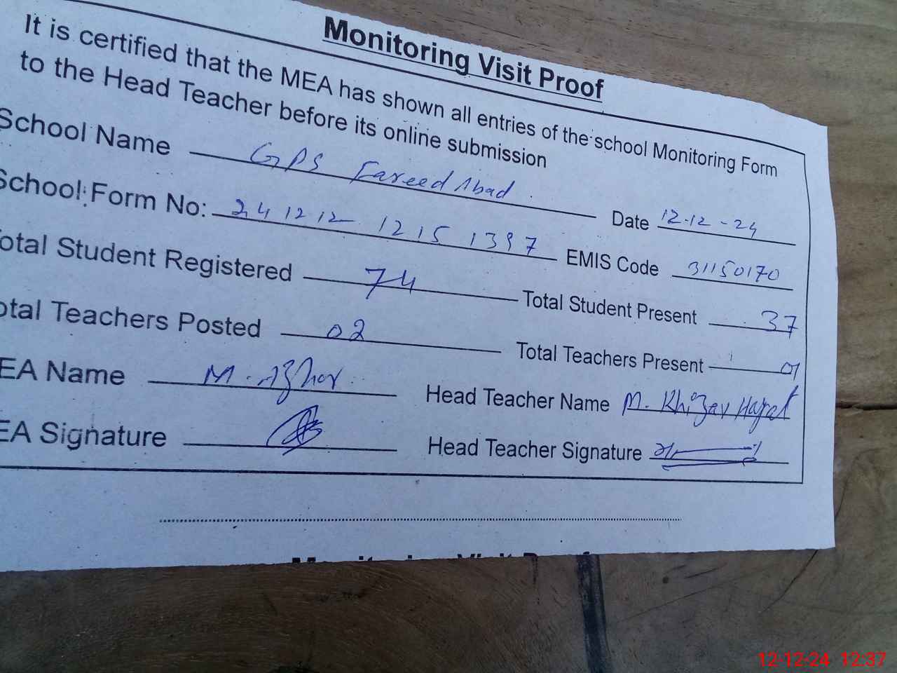 | EMIS Code: 31150170 | Name of School: GPS FARID ABAD | |||