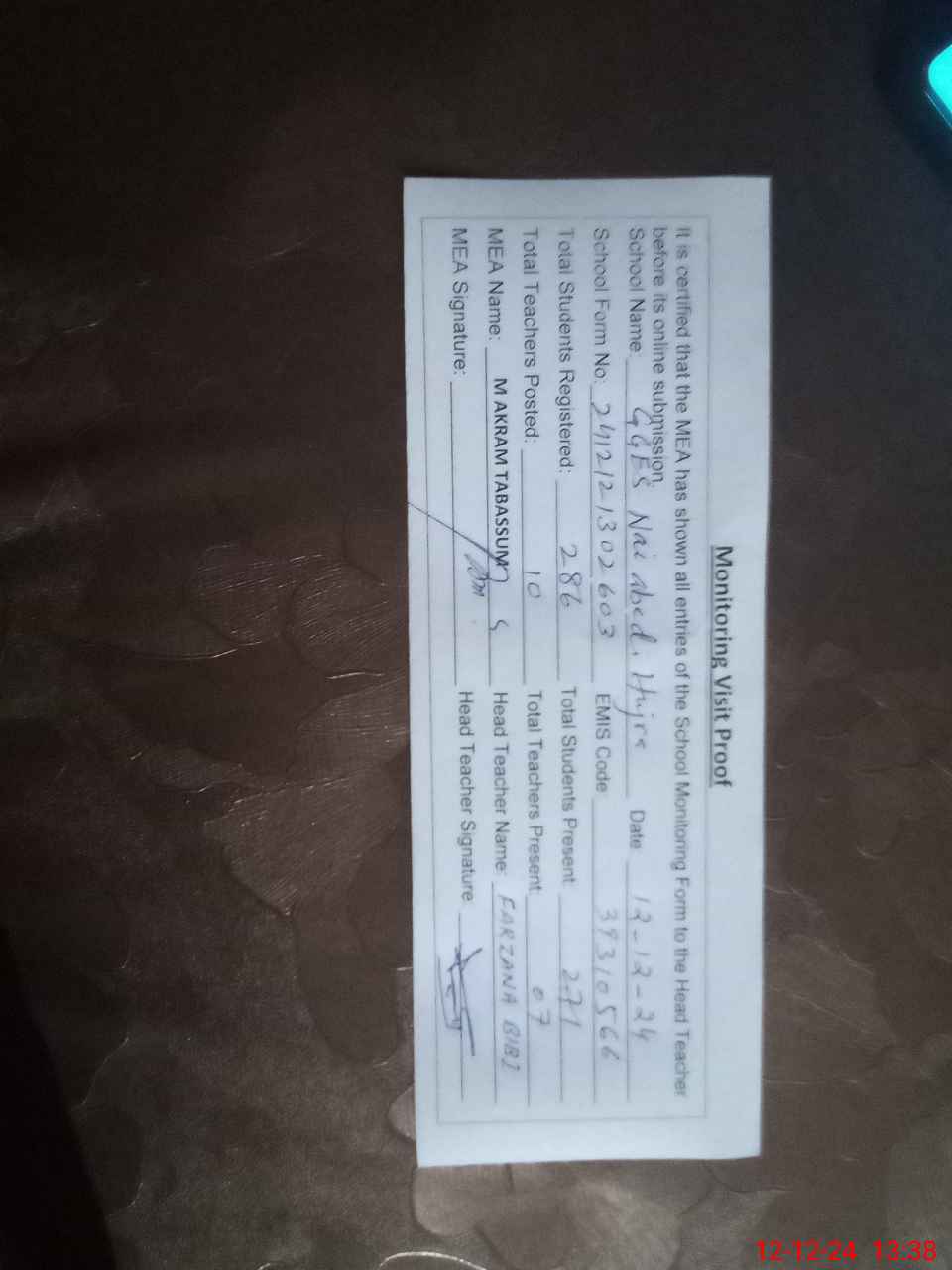 | Attendance Register | Head Teacher | MEA with School | Visit Proof |