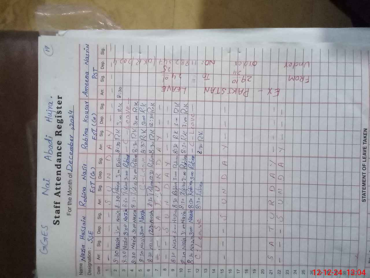 | CNIC | Full Name | Designation | R/C | Absence During Last Calender Month |