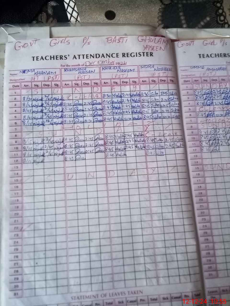 | CNIC | Full Name | Designation | R/C | Absence During Last Calender Month |