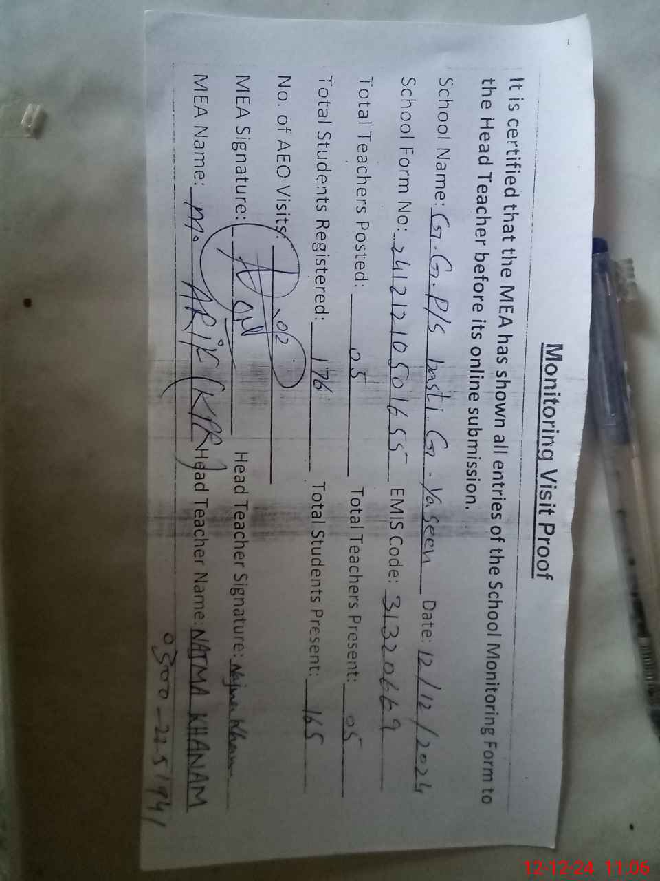| Attendance Register | Head Teacher | MEA with School | Visit Proof |