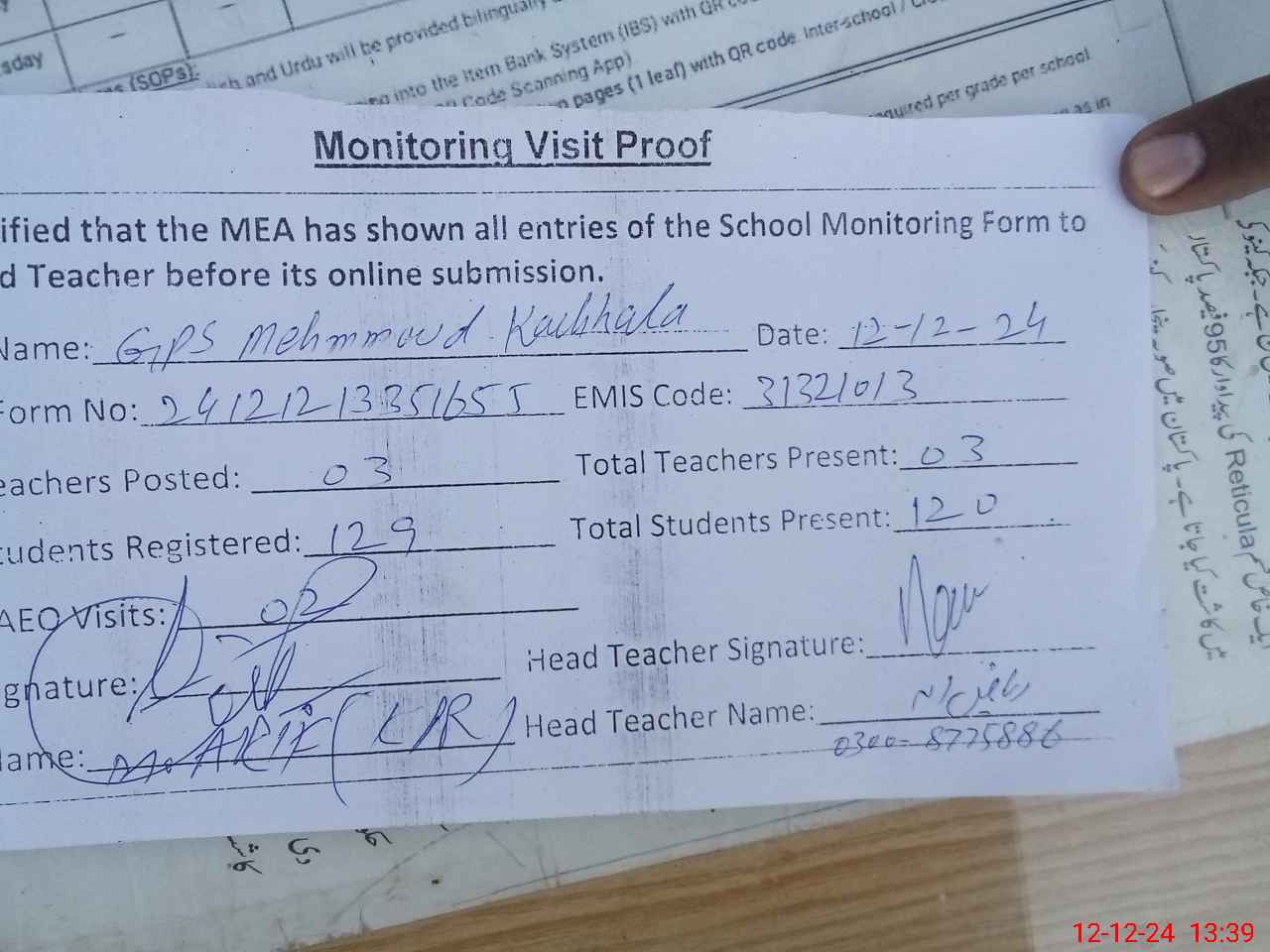 | Attendance Register | Head Teacher | MEA with School | Visit Proof |