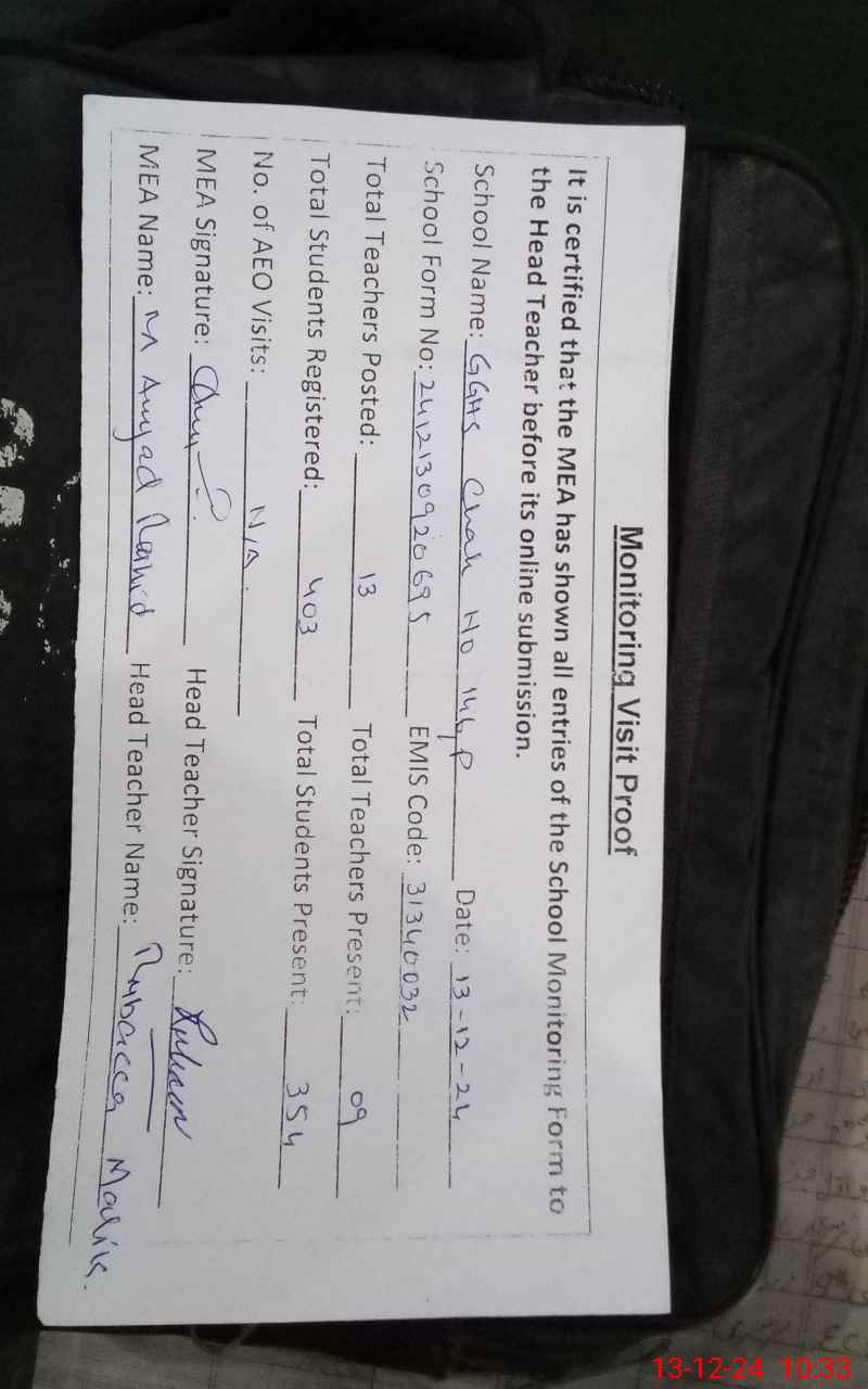 | Attendance Register | Head Teacher | MEA with School | Visit Proof |