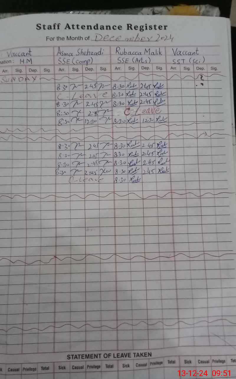 | Remarks (Use Separate Page if Required): Sse asma shehzadi EST shakila Naz EST shahnaz Parveen and EST Sobia Abbas marked absent as their sanctioned leave not produced at the time of inspection | |||||