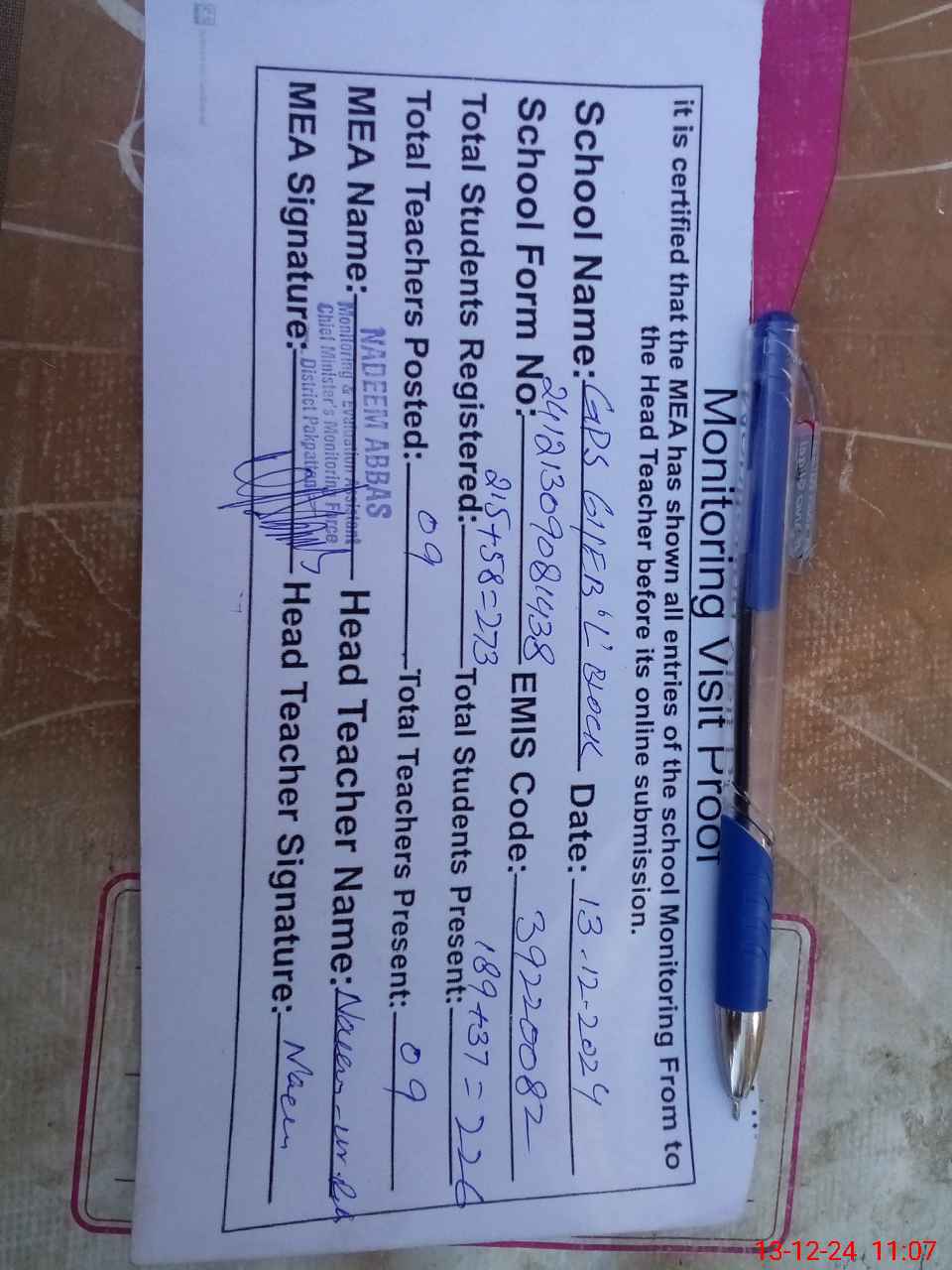 | Certified that this School was Inspected by the Undersigned MEA/DMO Today and the Information Stated Above is as Per Record. | |||||