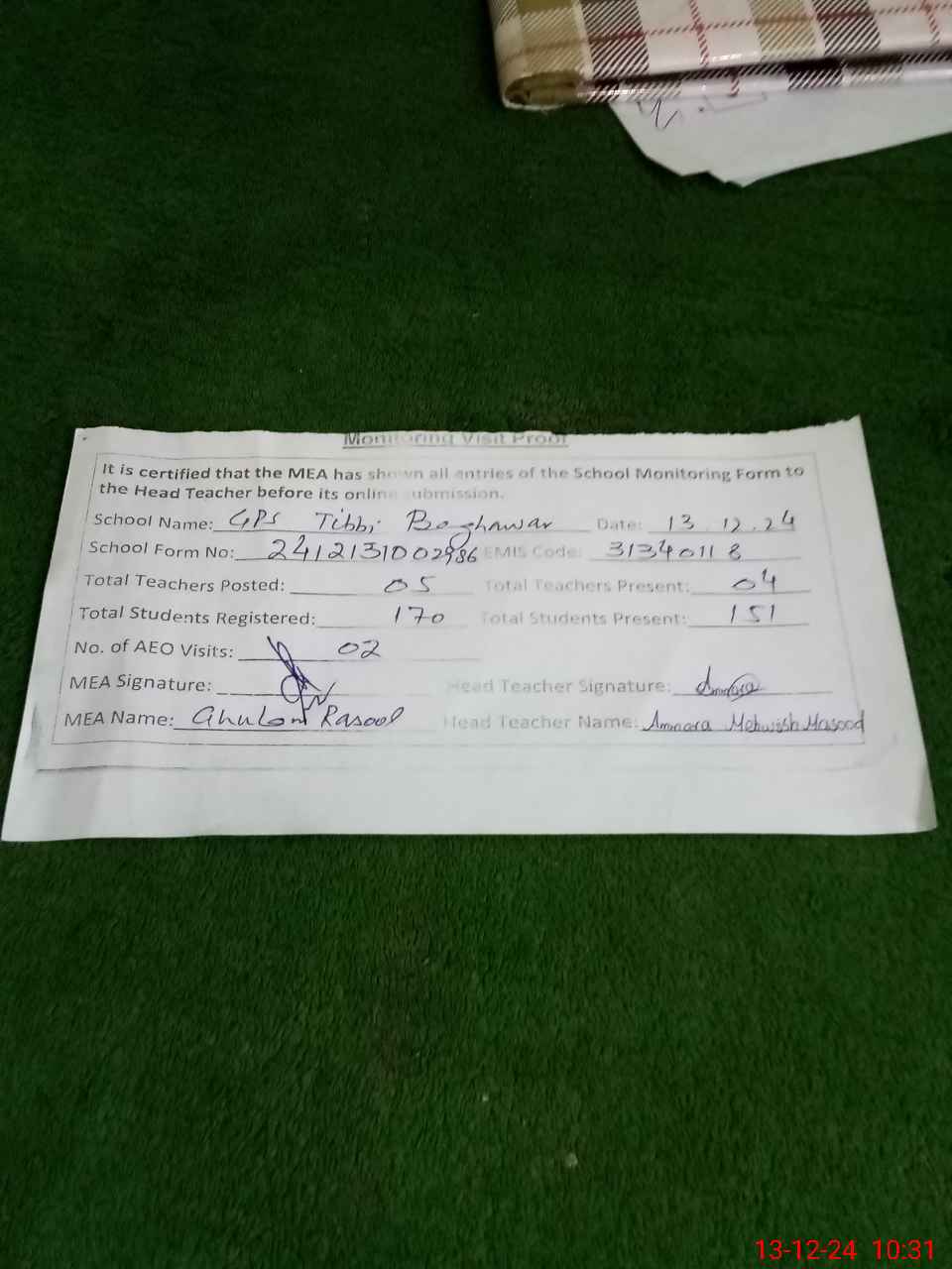 | Attendance Register | Head Teacher | MEA with School | Visit Proof |