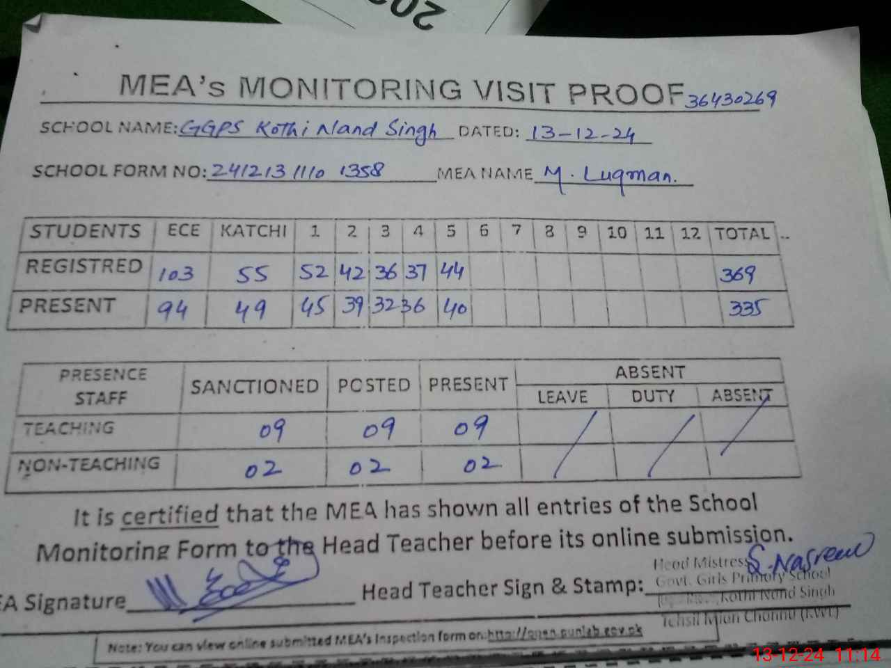 | Attendance Register | Head Teacher | MEA with School | Visit Proof |