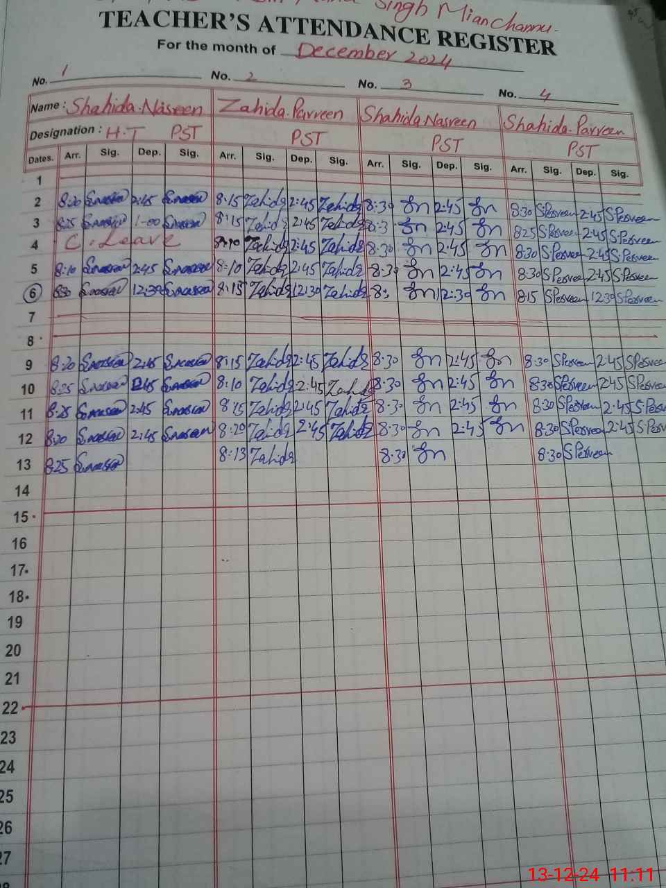 | CNIC | Full Name | Designation | R/C | Absence During Last Calender Month |