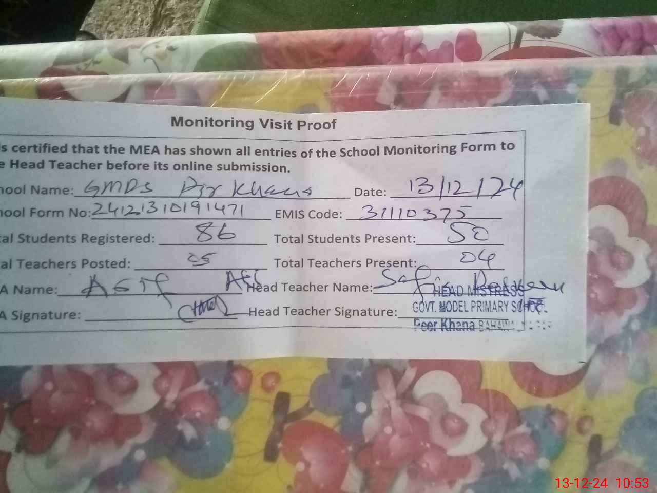 | EMIS Code: 31110375 | Name of School: GMPS PIR KHANA | |||