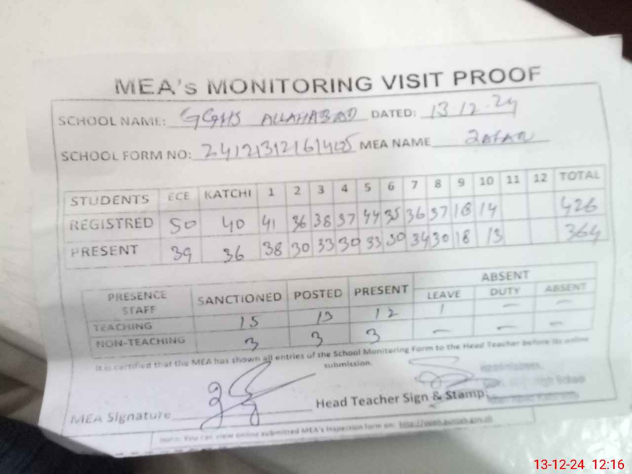 | Attendance Register | Head Teacher | MEA with School | Visit Proof |