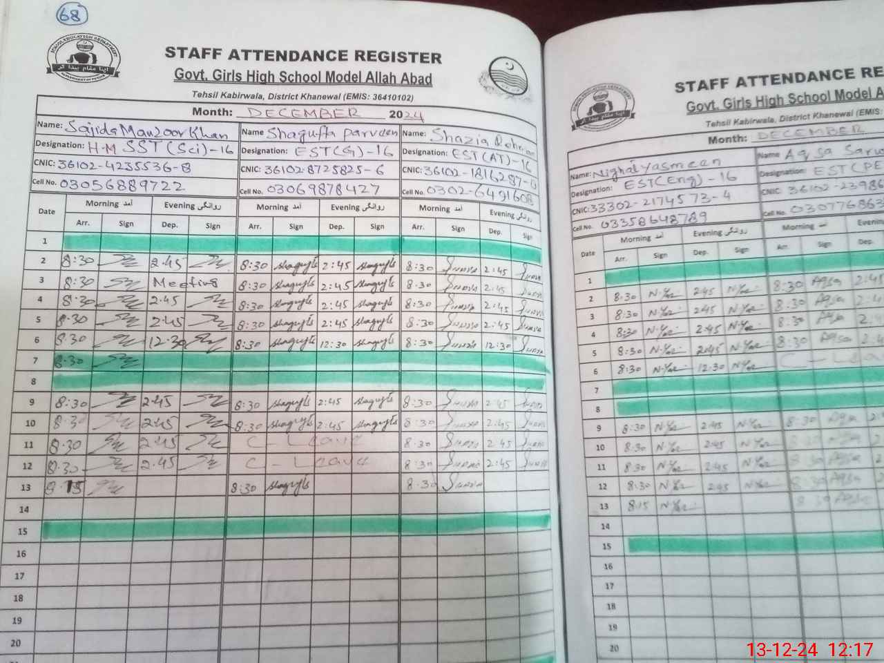 | CNIC | Full Name | Designation | R/C | Absence during last cal. month |