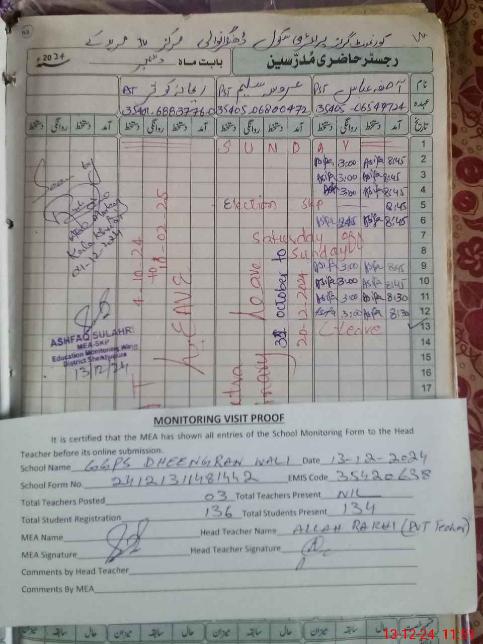 | Attendance Register | Head Teacher | MEA with School | Visit Proof |
