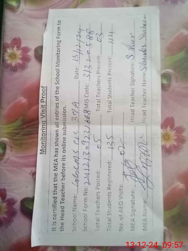 | Attendance Register | Head Teacher | MEA with School | Visit Proof |