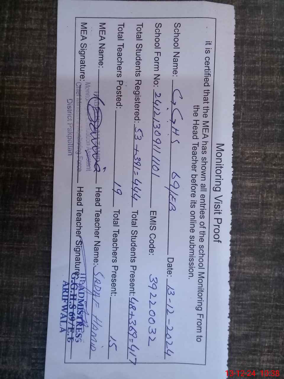 | EMIS Code: 39220032 | Name of School: GGHS 69 EB ARIF WALA | |||