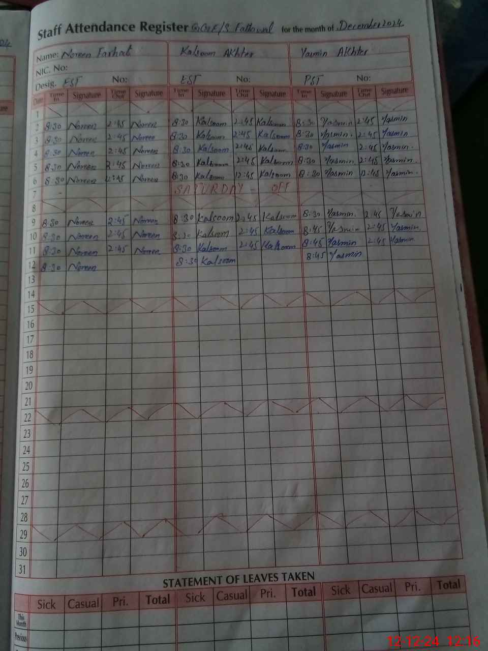 | CNIC | Full Name | Designation | R/C | Absence During Last Calender Month |