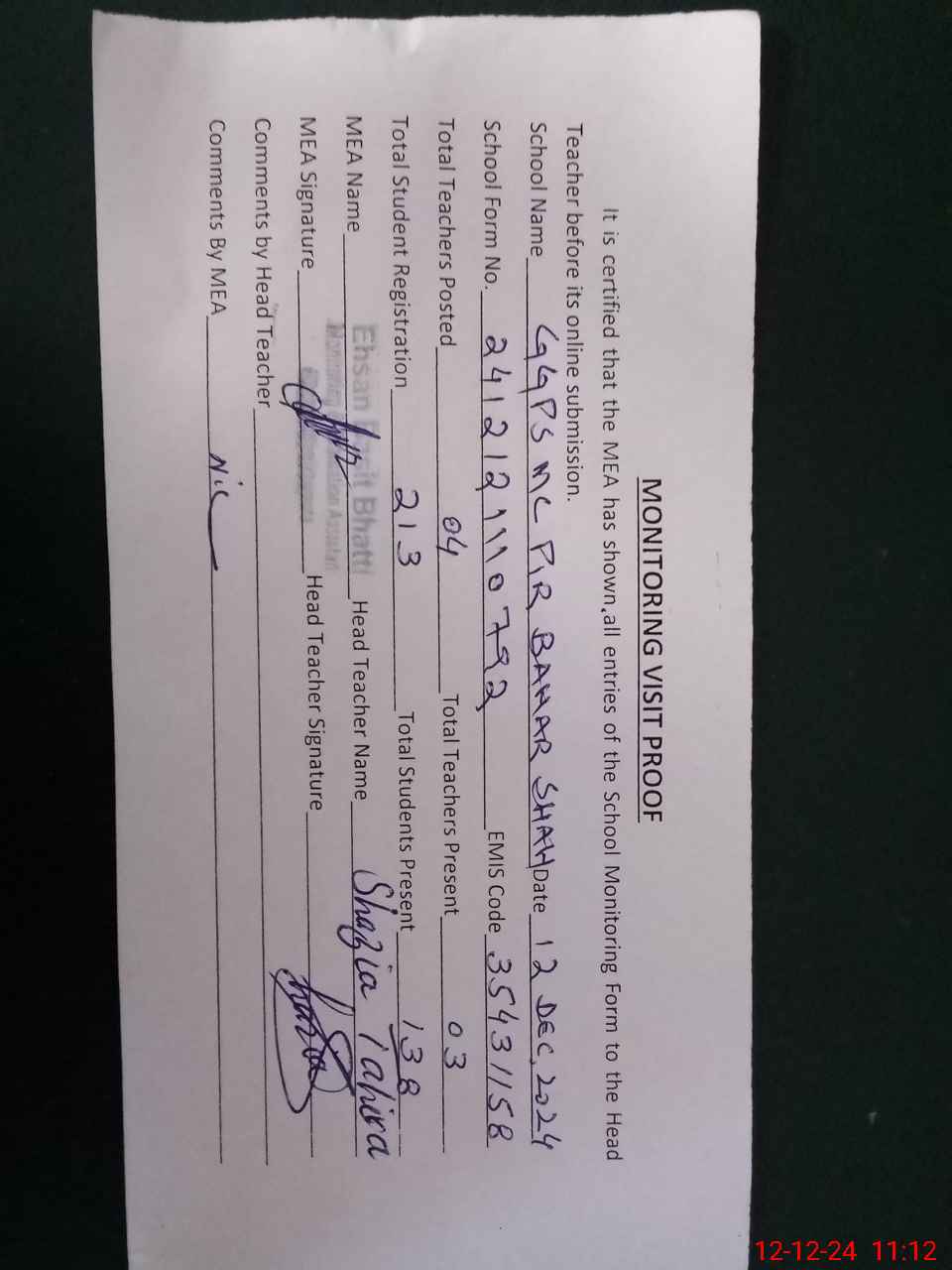| EMIS Code: 35431158 | Name of School: GGPS MC PIR BAHAR SHAH | |||