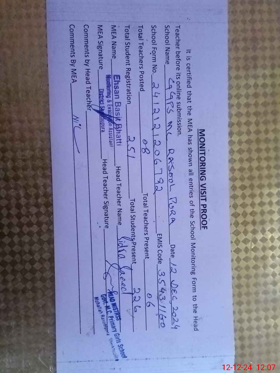 | Attendance Register | Head Teacher | MEA with School | Visit Proof |