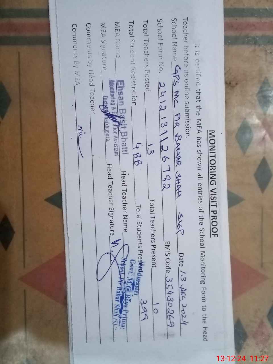 | EMIS Code: 35430269 | Name of School: GPS MC PIR BAHAR SHAH | |||