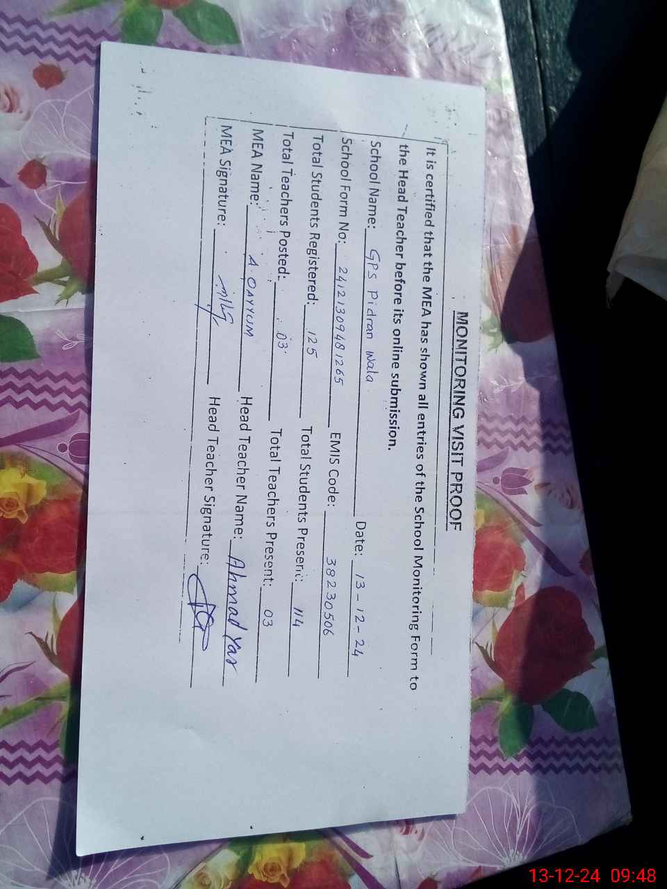 | EMIS Code: 38230506 | Name of School: GPS PIDRAN WALA | |||