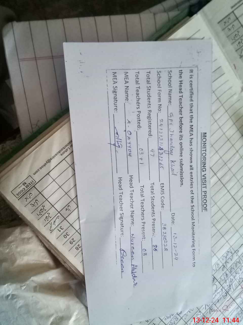 | Attendance Register | Head Teacher | MEA with School | Visit Proof |