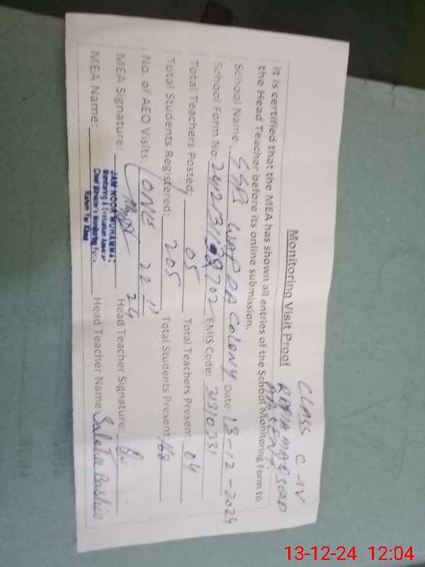 | Total no. of Classrooms: 12 No. of Classrooms Used for Teaching: 11 No. of Classrooms Storing Old Furniture, FTBs, etc: 0Comments if Any: Satisfactory 1 office Civ Rafia Maqsood is absent from the school since 25 October 23 which is irregular contrary to rule and regulation please stop her salary at earliest |