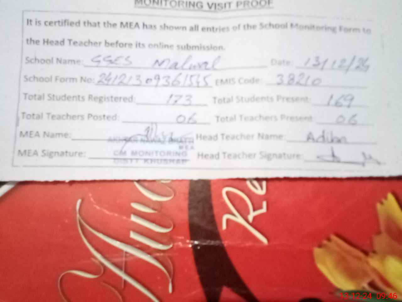 | Attendance Register | Head Teacher | MEA with School | Visit Proof |