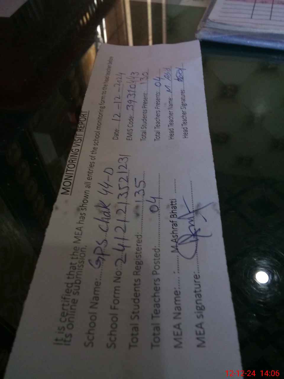 | Attendance Register | Head Teacher | MEA with School | Visit Proof |