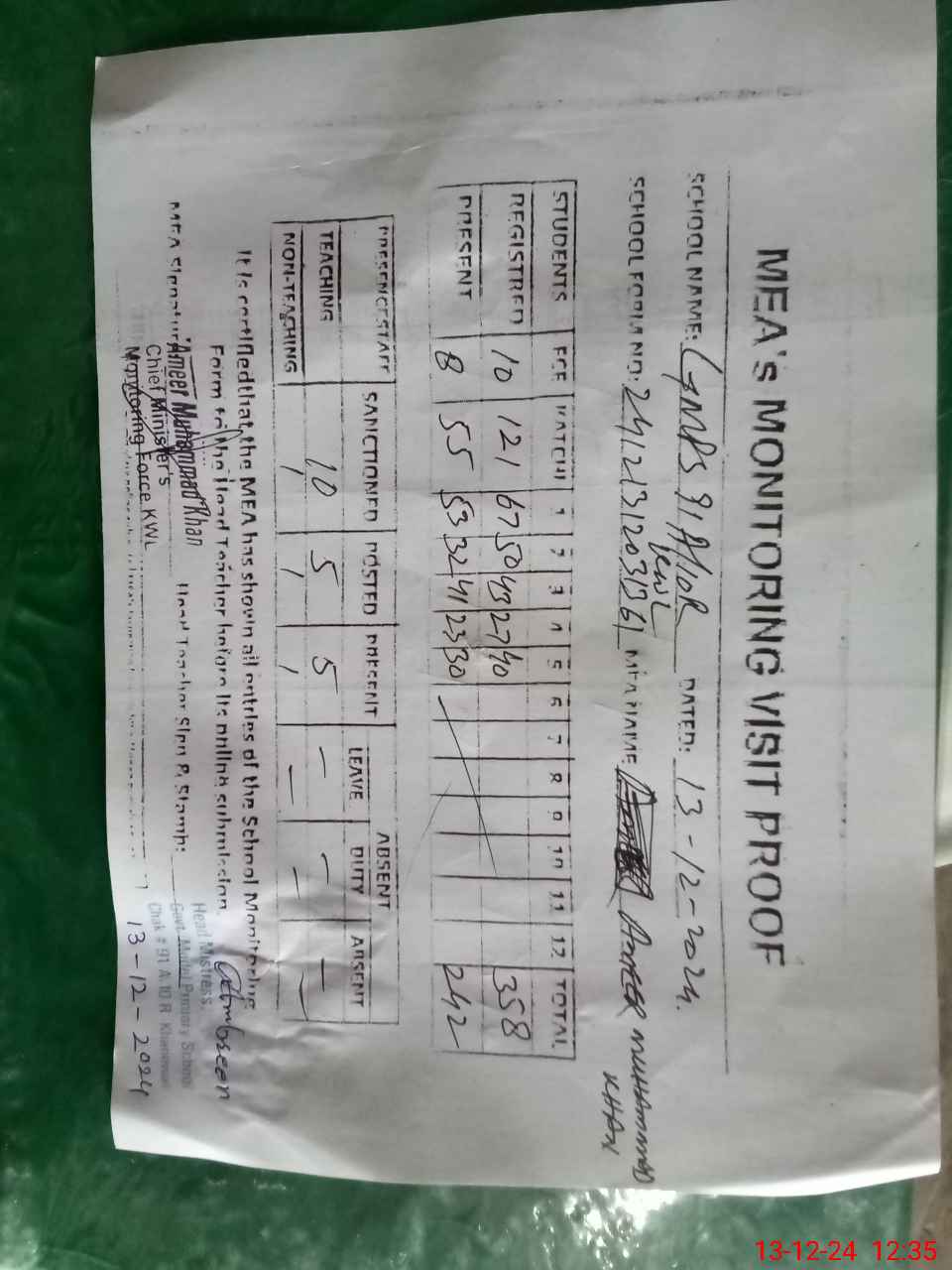 | Attendance Register | Head Teacher | MEA with School | Visit Proof |