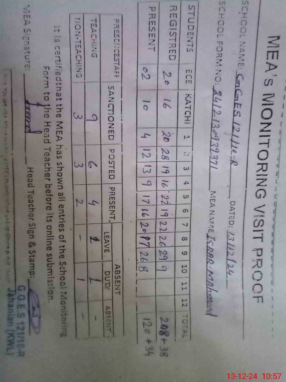 | Attendance Register | Head Teacher | MEA with School | Visit Proof |
